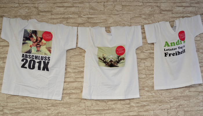 Wir bedrucken eine Fläche von max. DIN A3 auf weiße T-Shirts: Fotos, Logos, Texte oder alles zusammen. Vorne und hinten. In Farbe oder Schwarz/Weiß.