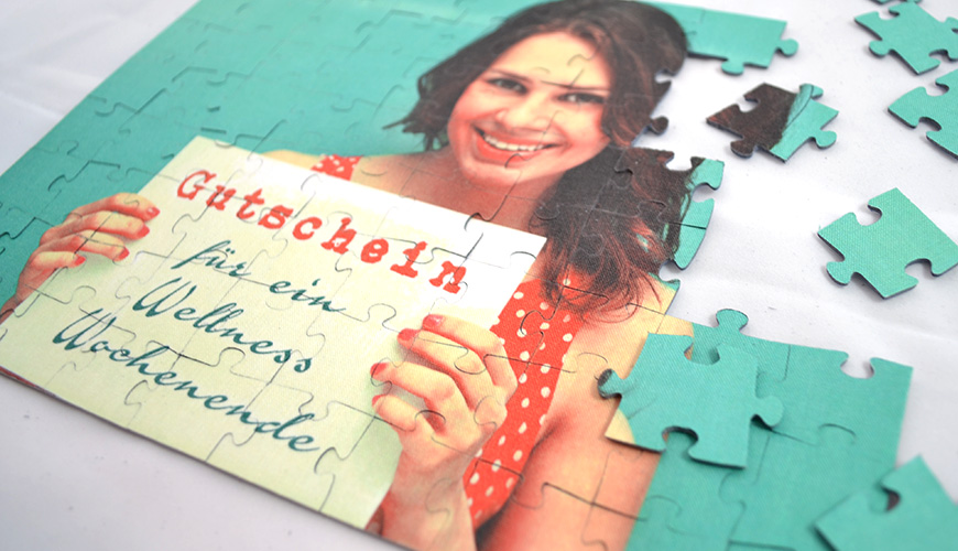 Schenken Sie Ihren Gutschein (z.B. für ein Wellness-Wochenende) auf ein Puzzle gedruckt!