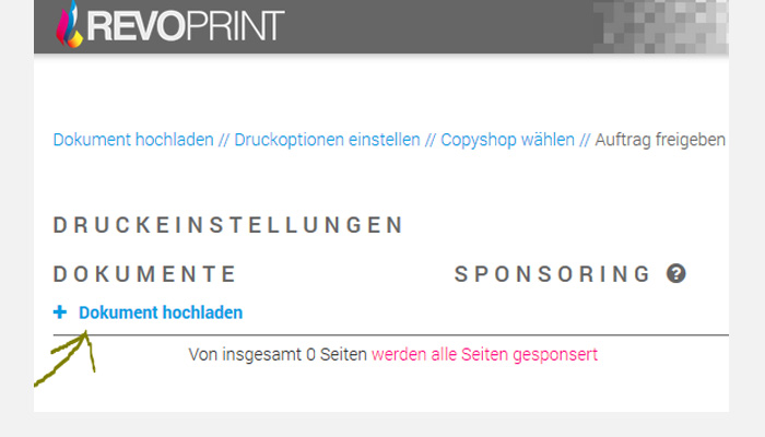 Über den grünen DRUCKEN-Button (links im Bild) Ihre Dateien hochladen. (Achtung: es werden über diesen Weg nur PDFs akzeptiert).