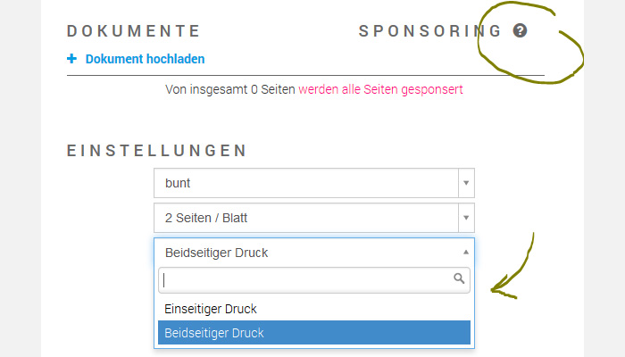 Machen Sie Ihre Angaben: S/W oder Farbe, die Seiten 1seitig oder 2seitig bedruckt, mit oder ohne Werbung. (Achtung: nur mit Werbung ist Ihr Druck kostenlos!)